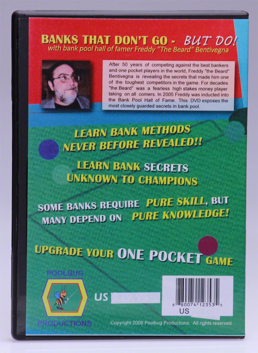 BANKS THAT DON’T GO – BUT DO with bank pool hall of famer Freddy “The Beard” Bentivegna. After 50 years of competing against the best bankers and one pocket players in the world, Freddy “the Beard” Bentivegna is revealing the secrets that made him one of the toughest competitors in the game. For decades “the Beard” was a fearless high stakes money player taking on all comers. In 2005 Freddy was inducted into the Bank Pool Hall of Fame. This DVD exposes the most closely guarded secrets in bank pool.This new 2 volume set from Freddy “The Beard” Bentivegna will teach you banks previously known to only a handful of elite players. Learn the Secrets of “Banking in the Round”