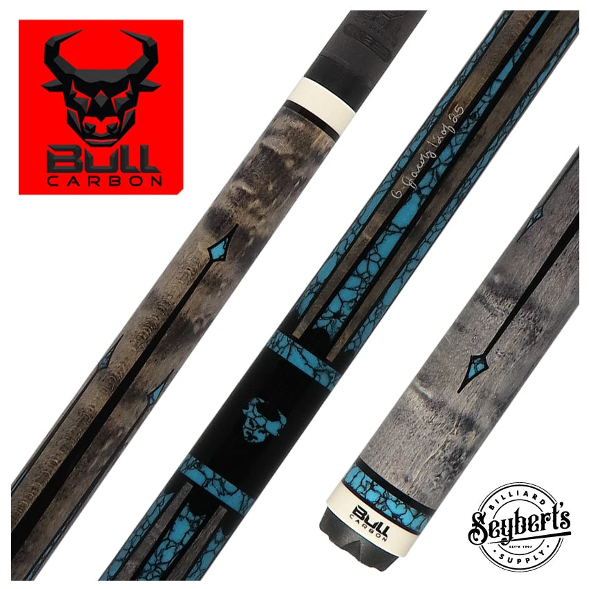 Bull Carbon Cues wanted to make a cue with custom feel and look so they recruited one of the best cue designers on the market and with the help of Jacoby Cues they came up with the Bull Carbon Limited Edition Series Cues by Jacoby. Each cue is hand signed and numbered giving a truly limited cue feel. From the stunning gray stained Maple forearm and buttsleeve and the blue recon inlays this cue exudes sophistication and exclusivity. Finishing off this cue is your choice of diameter of Bull Carbon LD Carbon Fiber Shaft.