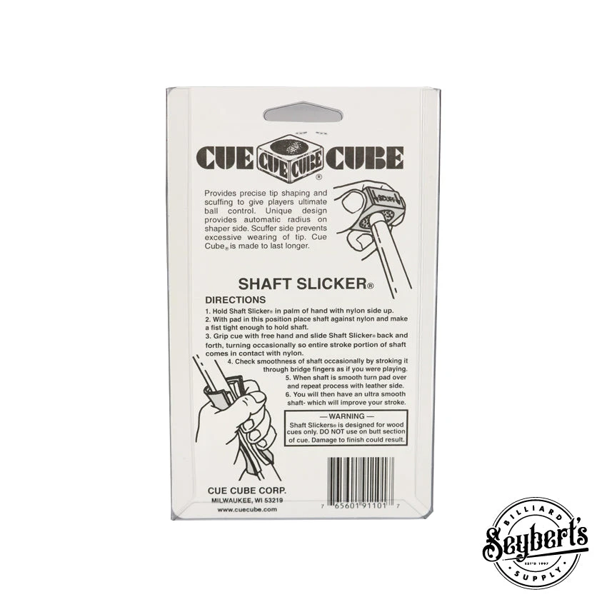 Keep your cue looking and feeling brand new with the Cue Cube .418″ Nickel with Shaft Slicker Combo! This leather two-sided cleaner and polisher effortlessly removes grime and chalk, while the Cue Cube shapes and scuffs your cue tip for optimal chalk retention. Get ready for the perfect shot every time!