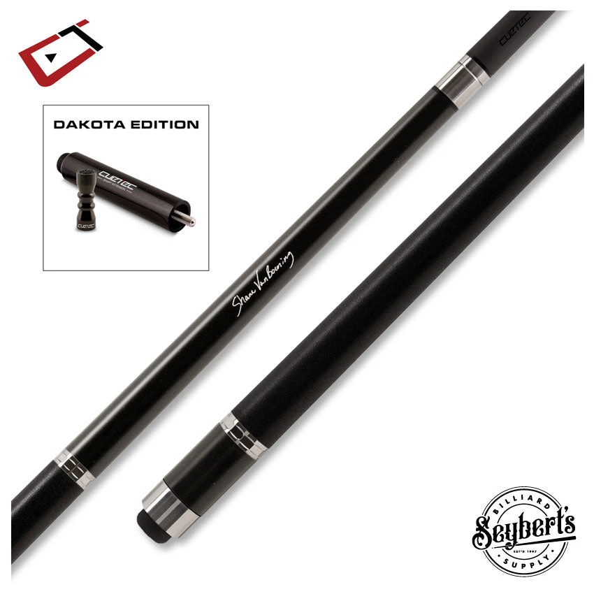 Cuetec Cynergy SVB Gen One Dakota Series Black Starlight Cue  . The SVB Black cue Dakota Series is made with a black grade A+ hard maple butt with black Irish linen wrap, stainless steel 3D rings, collars and butt cap . Completing this cue is Cynergy 15K high-performance carbon fiber composite shaft. Take your game to the next level with the same cue fielded by five-time U.S. Open Champion Shane Van Boening. Dakota Series cues come with  matching cue extension and Bowtie tip tool