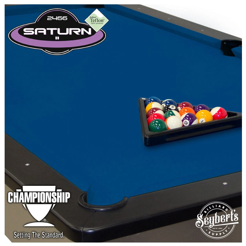Championship Saturn Euro Blue Pool Table Cloth. Saturn cloth is a premium cloth with  DuPont Teflon coating for added stain protection. A blended wool cloth with a tight weave that provides a smooth ball roll and an unequaled stretch for ease of application. All Championship cloth comes precut with 6 rail clothes as well as the bed cloth including a table spot.