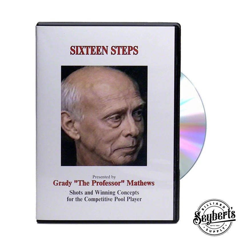 Grady Mathews Sixteen Steps Instructional DVD. Grady Mathews reveals the sixteen most important aspects of competitive pool and explains how a professional player would relate with each one. Advanced information on grip, stance, and tempo are covered, along with demonstrations on shot selection and safeties. Filled with great tips. Learn to play aggressively, yet smoothly, never lacking one or the other. Expand your banking knowledge. This DVD is a professional guide for advancement of your competitive game. Study the information, practice it, and enjoy playing at a higher level