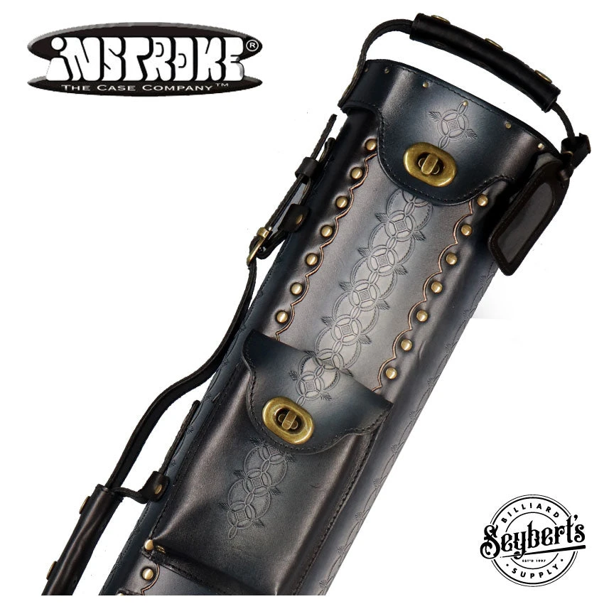 Instroke Saddle 3×5 DO5 Black Air Brushed Case. The Instroke D05 case is a black leather case with grey air-brushed accents on tooling. The case has hand tooled design going down the front and back of the case. Considered by most to be the best cue case in the industry today, Instroke cue cases are unmatched for quality material and workmanship to provide you with the very best protection for your pool cue investment. Each Instroke case has a side pocket for a jump cue handle. Cue butts and shafts can be put in either way easily. Each of the Saddle Series cases is hand stained. Colors may vary from what is pictured.