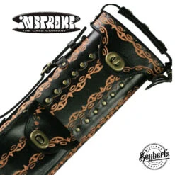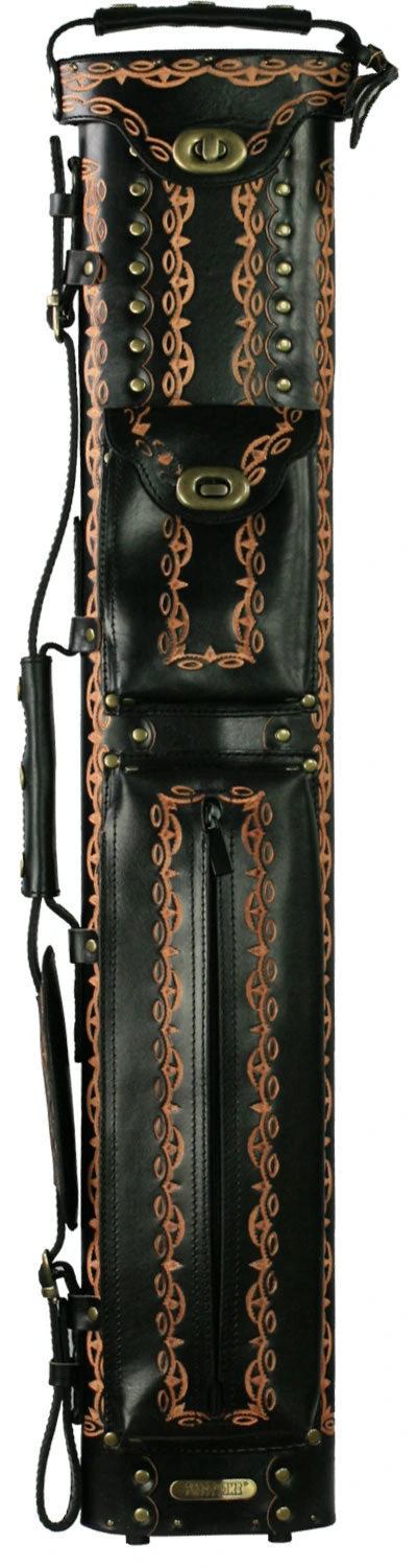 Instroke D01 2×4 black hand tooled pool cue case. This case is a made of black leather and has hand tooled design on the front and back of case.