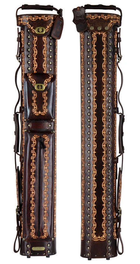 Instroke D01 2×4 dark brown hand tooled pool cue case. This case is a made of dark brown leather and has hand tooled design on the Front and back of case.