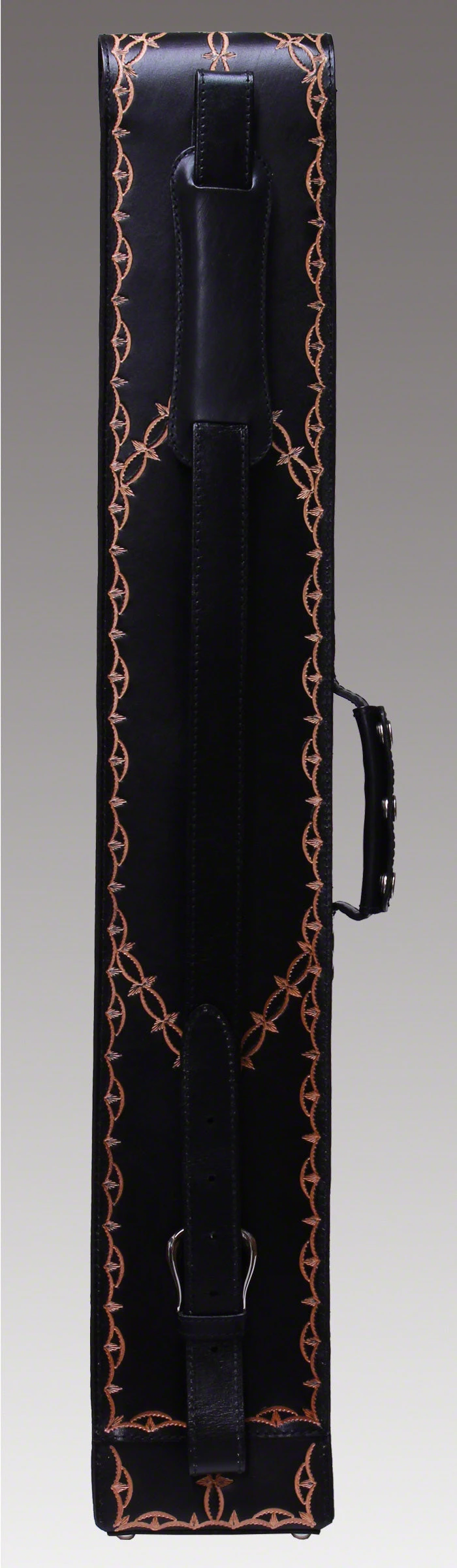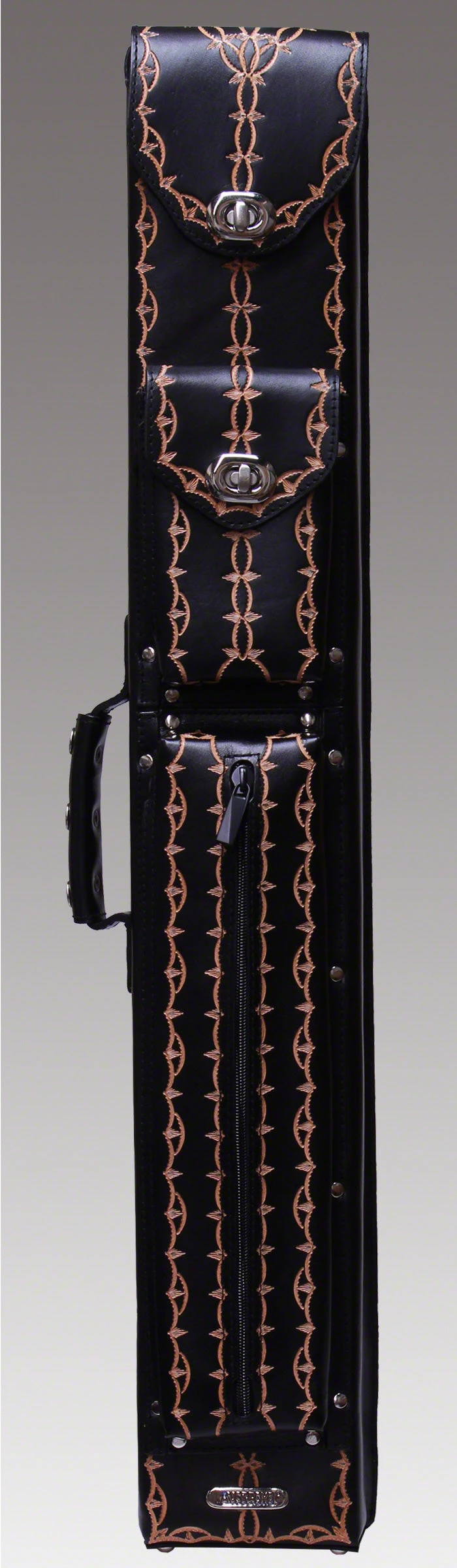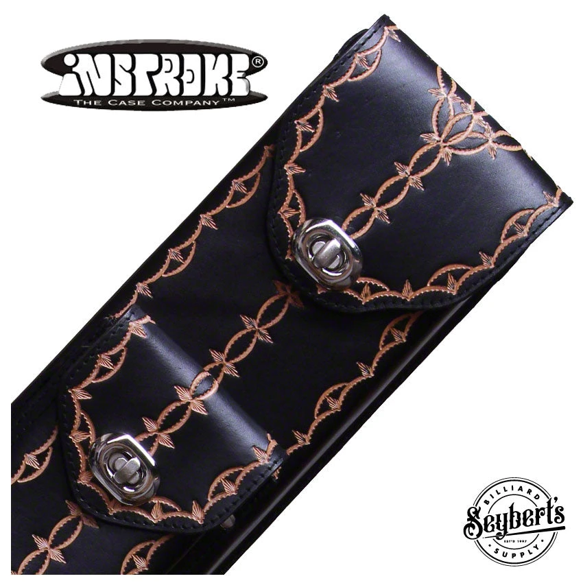 Instroke FIT-A 2×4 black hand tooled pool cue case. This case is a made of black leather and has hand tooled design on the front and back of case. Interior has cloth sleeve dividers.