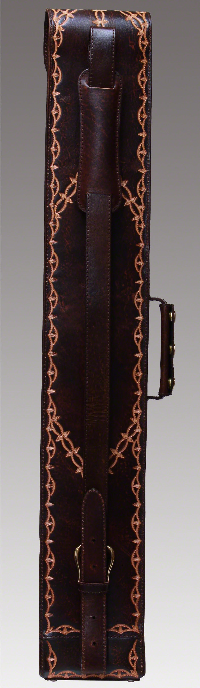 Instroke FIT-A 2×4 brown hand tooled pool cue case. This case is a made of black leather and has hand tooled design on the front and back of case. Interior has cloth sleeve dividers.