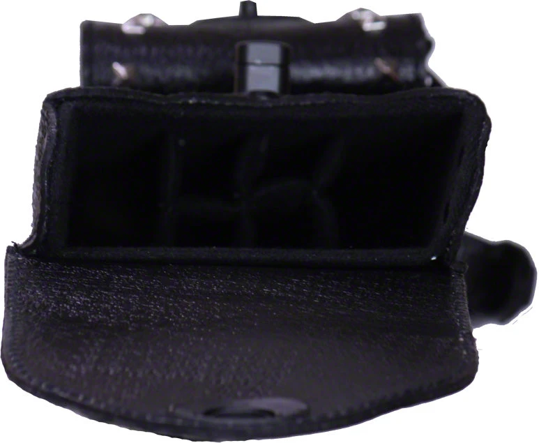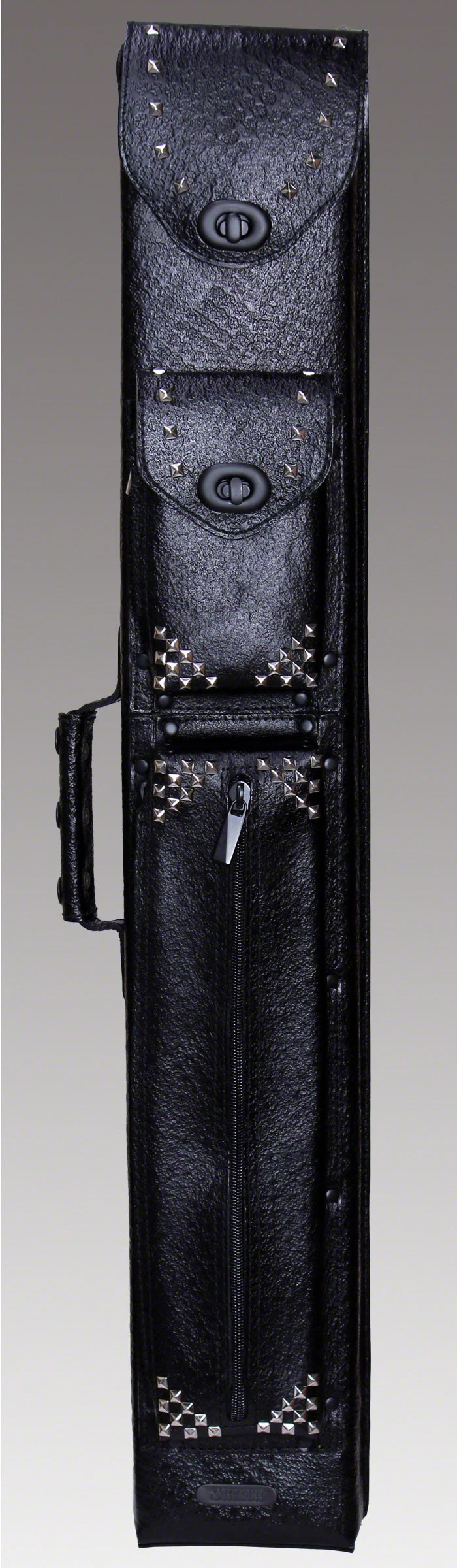 Instroke FIT-D 2×4 black leather cue case with silver accents. This case is a made of textured black leather and has silver rivet accents. Interior has cloth sleeve dividers.