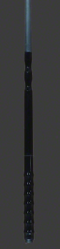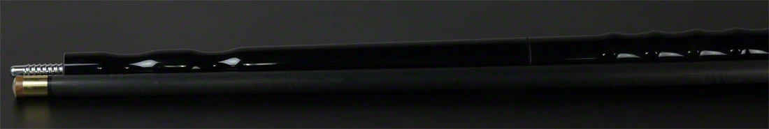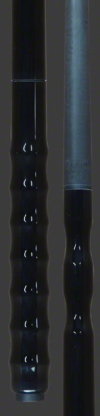 Jacoby BlackOut Extreme Jumper Carbon Jump Cue has a black stained extended handle. The top portion has  2 finger groove at the joint for a ‘darting’ technique and multiple bells at the end for a ‘stroking’ technique. The shaft has a stiff taper with a G-10 phenolic tip and a 3/4″ brass ferrule. The jumper has a radial pin as well as a weight system to enhance the shot.