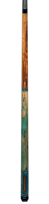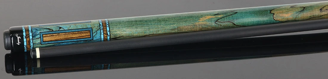 - Striking Design: A beautifully crafted Bocote forearm seamlessly transitions into a Spalted Maple buttsleeve, showcasing the wood’s intricate natural grain. The Bocote window inlays, elegantly framed by vivid Blue Veneers, add a touch of sophistication and depth to the cue’s design.