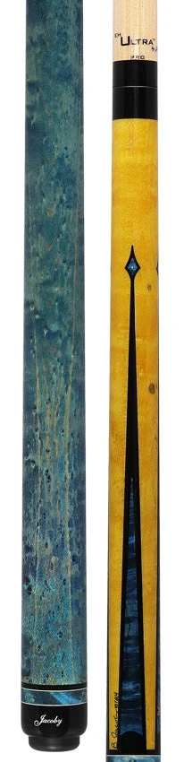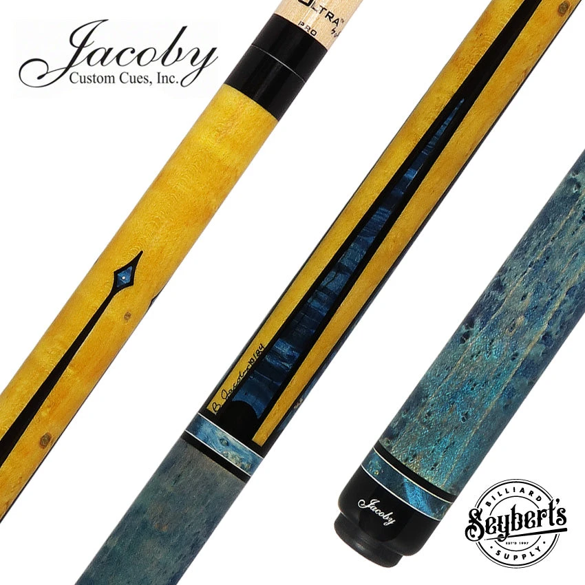Indulge in luxury with the Jacoby Custom Play Cue. The honey-stained Birdseye Maple design is accented by blue Impregnated Burl points and teal-stained Birdseye Maple wrap section. The 29″ Jacoby Ultra Pro laminated wood shaft, 12.75mm diameter, and Tiger Everest tip offer precise shots, while the blue impregnated Burl and black and white ringwork give a touch of sophistication. Experience the exclusive style and performance of this premium cue.