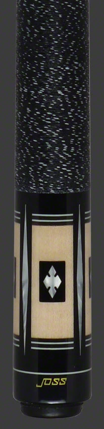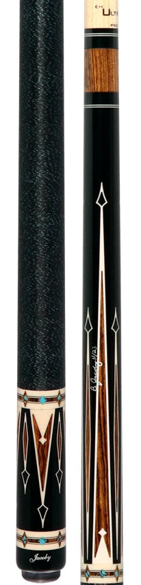 This expertly crafted pool cue features a striking ebony design accented with four short and four long Bocote points, each outlined in elegant Elforyn on both the forearm and butt sleeve. The black wrap with blue speckled Irish linen offers a comfortable grip, while the Jacoby Ultra Pro laminated wood shaft, measuring 12.80mm in diameter, ensures precision and durability. Equipped with a Tiger Everest laminated leather tip and a Jacoby radial joint, this cue combines superior materials and craftsmanship. Decorative Bocote bands with turquoise diamond inlays surrounded by German Elforyn add a refined touch to its sophisticated appearance.