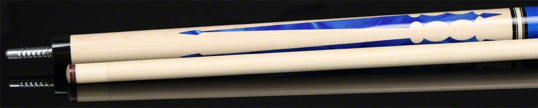 Jacoby MAG 2 Series blue custom pool cue. This cue is constructed with a natural Maple forearm with 4 blue pearl floating points. Butt sleeve is natural Maple with 4 matching forearm blue pearl inlays. Completing cue is a blue stained wrap section with natural Maple and black ring work and a Jacoby hard Maple shaft.