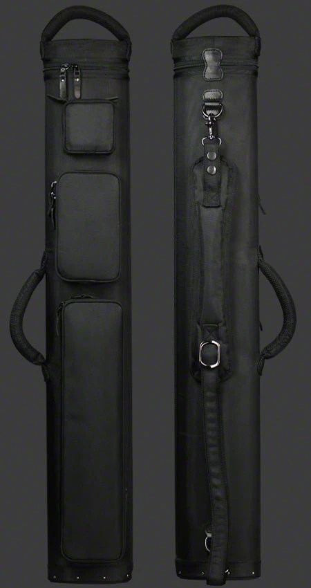 Black JB Ultimate Rugged Cue Case cue case.  This case  is designed to hold 2 butts and 5 shafts or 3 butts and 4 shafts, also available in 3×6 and 4×8.  JB Ultimate Rugged cases are  made of durable nylon/polyester material with reinforced leather stress points.  The case has a double zipper top along with 3 storage pockets, and a jump cue compartment. The cues shown in the picture are not included.