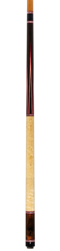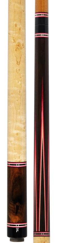 Fresh from renowned cue maker Jim Pierce is a true masterpiece of quality and craftsmanship. This stunning Southwest design starts out with a select piece of Zircote wood for both the forearm and buttsleeve. The forearm has been accented with 6 Zircote points outlined in white, pink, and ruby veneers. The wrap section is made up of a stunning piece of highly figured Birdseye Maple for a sleek and comfortable grip. Finishing off this cue is two shafts one being Maple one being Torrified wood both shafts come in at 12.80mm and have a Ultraskin Medium Tip.