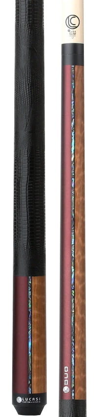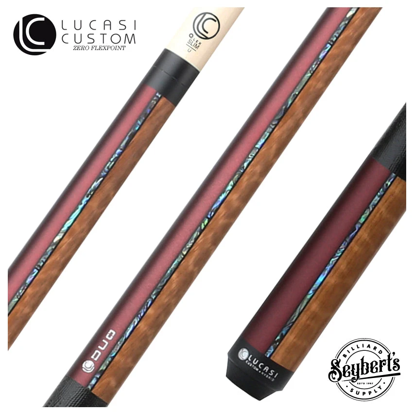 Experience the thrill of the newest Lucasi innovation, the Duo series pool cue! Featuring a bold matte finish of half garnet red paint and half exotic Apitong wood, with striking Mother-Of-Pearl inlays and a lizard embossed leather wrap. Plus, the quick-release Uni-loc shaft offers low deflection and precise control. Dare to dominate the game with Lucasi.