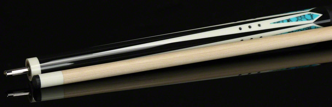 Lucasi Hybrid LHC98 pool cue has a mystic black forearm with 6 imitation bone inlaid points with blue stone and silver inlays. Butt sleeve is Mystic black with 6 imitation bone windows with 2 blue stone diamonds and crushed silver circles. Completing cue is a black embossed elephant leather wrap and Zero Flexpoint low deflection shaft.