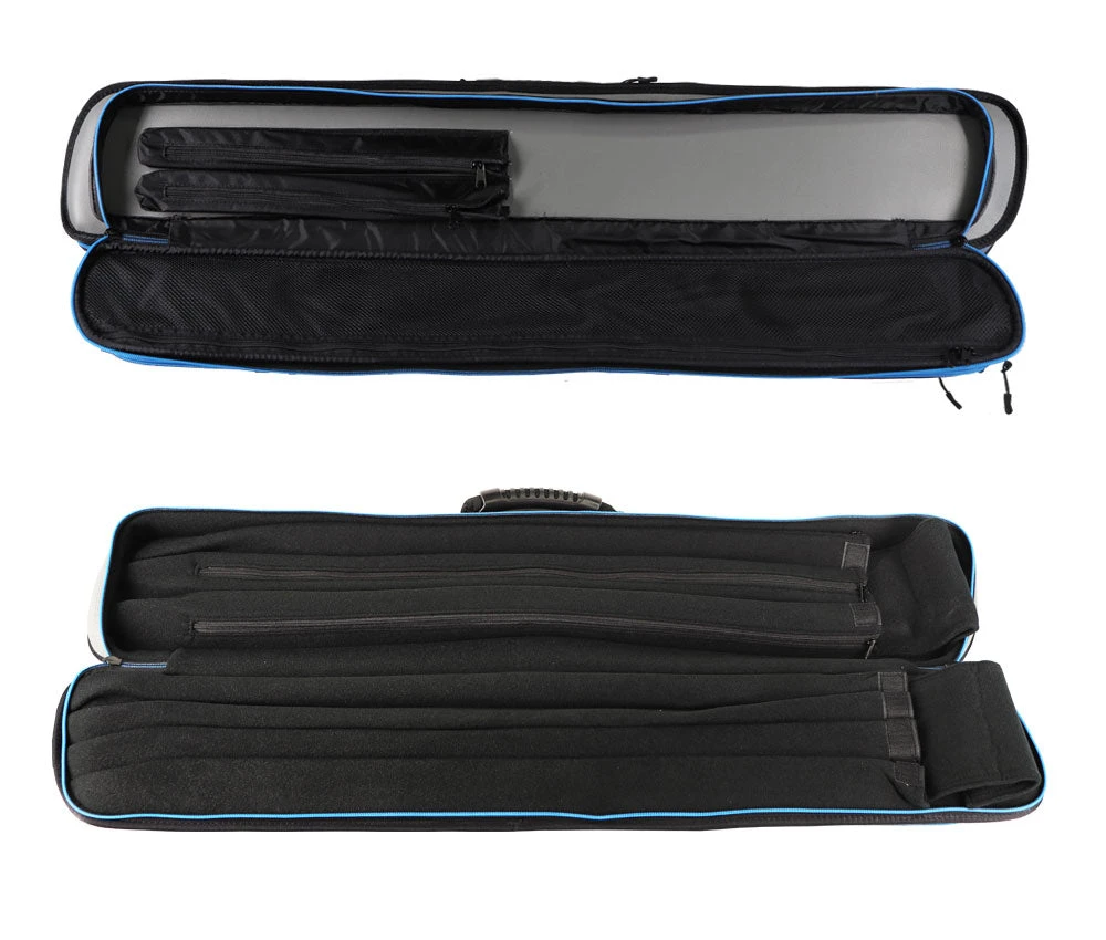 This luxury Lucasi Hybrid Rival case provides the perfect combination of practicality and sophistication. With a generous capacity of 3 butts and 4 shafts, the grey and blue leatherette material ensures a classy look, while seven zippered storage compartments provide plenty of room for all your accessories. The two open compartments make it easy to access your cues quickly, while still having the storage space and holders for a jump cue inside. It also comes with a removable shoulder strap and a suitcase handle provide convenience for travel.