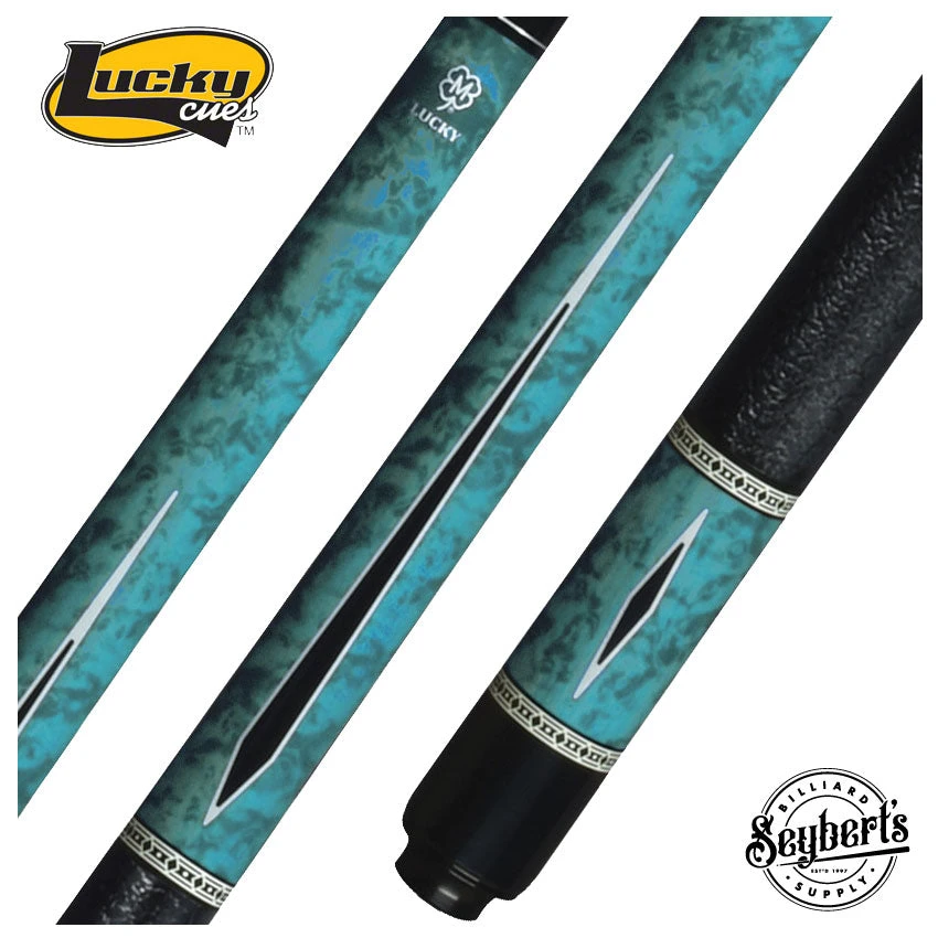 Lucky L55 cue has a blue  maple burl with black and white points overlay  design. Butt sleeve  is blue maple burl overlay with black and white diamond  design. Completing the cue is a black textured  wrap and overlay index ring work.