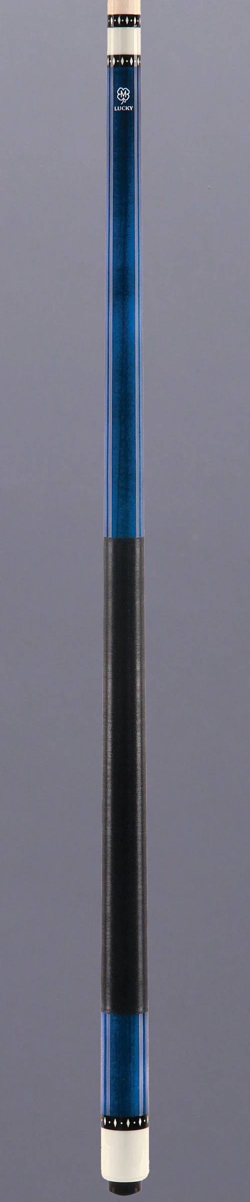 Lucky L7 cue has a blue  stained Maple forearm and butt sleeve. Completing the cue is a black and blue  Irish linen wrap and overlay index ring work.