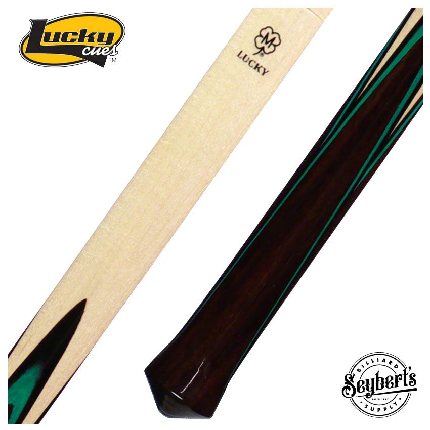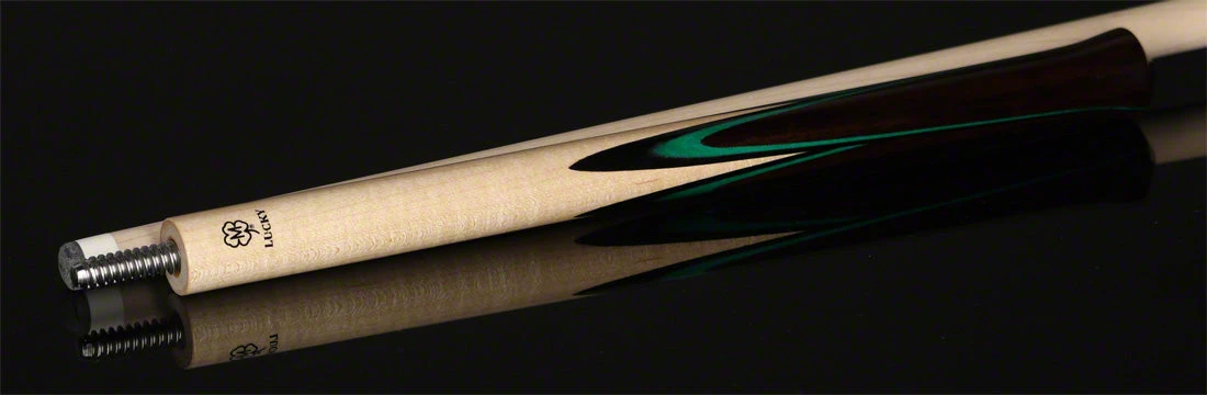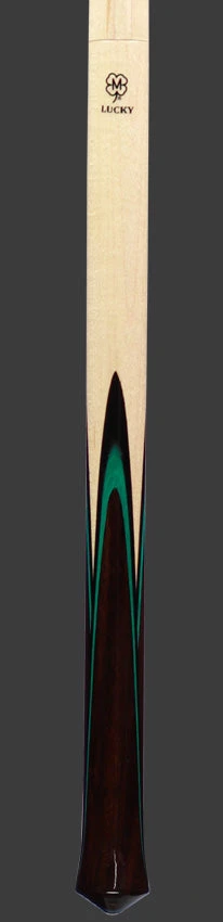 Lucky by McDermott Green Jump Cue, This 41 inch jump cue is constructed from rock hard maple and has Rosewood, green, and black butterfly veneer points. Completing the cue is a 14mm shaft with phenolic tip. Approx weight is 8.5oz.