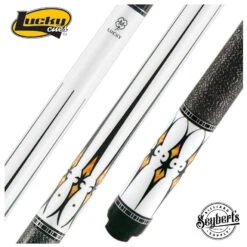 Lucky L40 cue has a painted white Maple forearm and butt sleeve. Forearm has a black with orange overlay white points design. Butt sleeve has matching overlay point design. Completing the cue is a black and white Irish linen wrap and overlay index ring work.