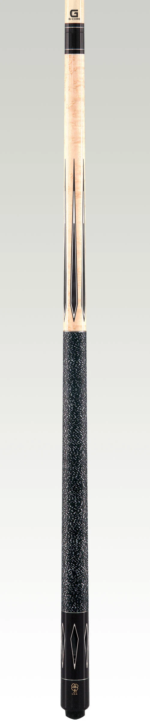 McDermott Pool Cue model G326 has a stained Birdseye Maple forearm with 6 grey pearl and bone points. The butt sleeve is black urethane with matching forearm points. Completing cue is a black / white Irish linen wrap and custom silver ring work. The McDermott G326 comes standard with the G-Core shaft.