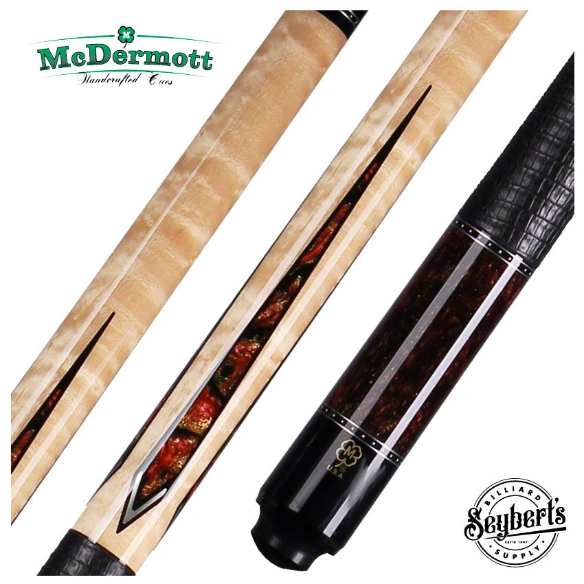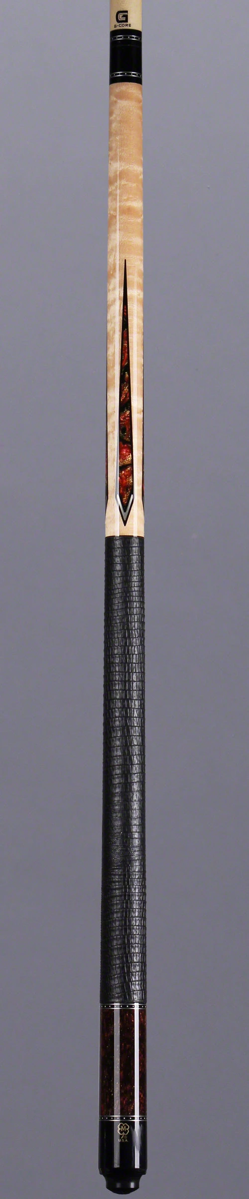 McDermott G431 Pool Cue has a natural Birdseye Maple forearm with 4 Midnight Glow black urethane and pewter points. Butt sleeve is Midnight Glow gold speck, brown, red, and black pearl sleeve . Completing cue is a lizard embossed leather wrap and G-Core shaft.