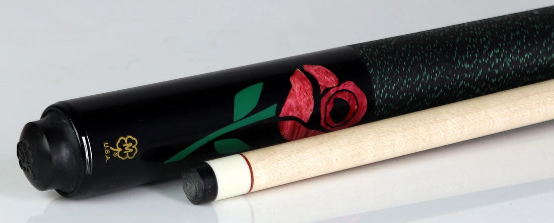 Mcdermott G435 pool cue. This cue has a Highly figured Premium American Cherry-stained Birdseye maple forearm  with 6 recon ebony points, tipped with green urethane. Butt sleeve is recon ebony with inlaid Red Box Elder Burl and green urethane rose design. Completing cue is black and green Irish line wrap.