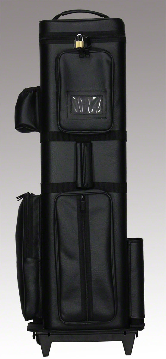 McDermott 20 x 20 dealer rolling case. This black vinyl case has an interior length of 30″ and will hold 20 butts and 20 shafts. Other features include 2 wheel 2 foot base, extendable handle, front and back handle, 3 storage pockets, cue ball pocket, and 3 cue side holder for displaying cues. Case comes with travel duffle bag along with lock and key.