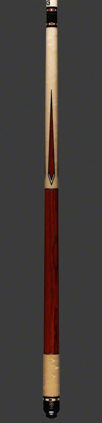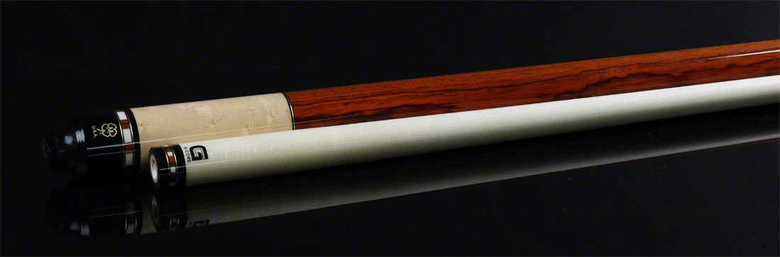 McDermott G519 pool cue has a  natural  Birdseye Maple forearm and butt sleeve.  Forearm has 4 Cocobolo floating points outlined in black with pewter bases. Butt sleeve has custom  Cocobolo, white, and brass ring work. Completing the cue is a  Cocobolo wrap with  brass ring work.  The McDermott G519 comes standard with the G-Core shaft.