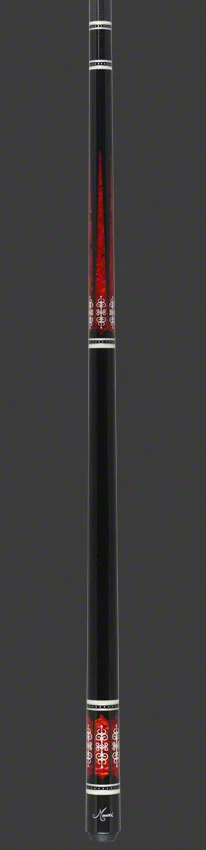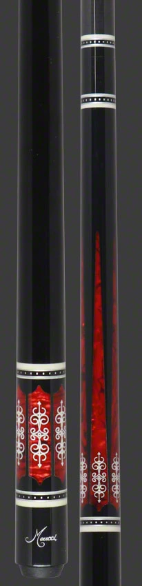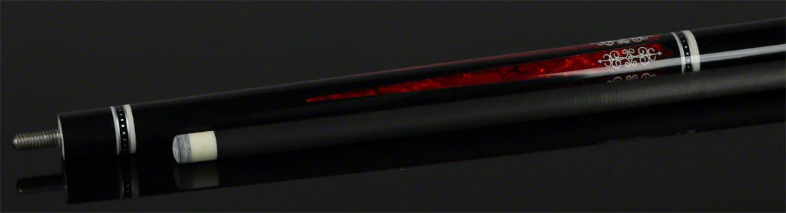 Meucci 2103 21st Century 3 pool cue. This cue has a black stain forearm with 6 Red Paua Shell deep-recessed inlaid points with an intricate scrimshaw design. The butt sleeve is black stain inlaid with 6 absolutely brilliant  Red Paua Shell deep-recessed inlaid Windows with an intricate scrimshaw design. Cue special features include black colored butt cap and joint collar with black and silver ring work. Completing the cue is a black no-wrap and Meucci Carbon Pro shaft.