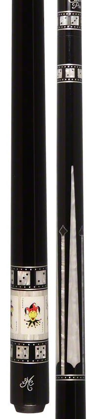 Experience the ultimate in luxury with the BMC10 Bob Meucci Customs Casino 10 Pool Cue, featuring an Ebony-colored Power Piston sleeve and 4 authentic white Paua Shell points adorned with card suit designs. The butt sleeve boasts 4 Joker cards framed by a 48-piece white Paua Shell sleeve trimmed with black, surrounded by 6 white Paua Shell dice and silver rectangles on a white background. The joint, shaft collar, and wrap all showcase intricate details of white Paua Shell and silver accents, exuding elegance and exclusivity. Complete with a premium Meucci Carbon Pro shaft, this cue is the epitome of sophistication.