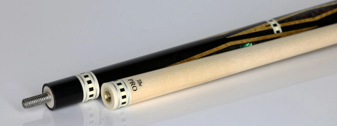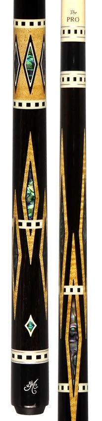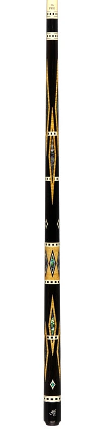 The Meucci Diamond Cue consists of  Ebony  inlaid with 60 diamonds of many high-quality materials. It starts with genuine African Ebony on the outside of all diamonds,  Curly maple centers with authentic Abalone shell diamonds. The Meucci Diamond Cue has eight sets of black fiber trim rings that are each inlaid with 12 white squares. That is a total of 96 mosaic squares. This Meucci Diamond Cue comes with A Wood Meucci The Pro shaft.