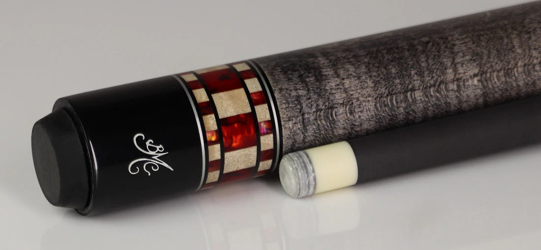 Meucci Red Diamond Pro Pool Cue. This cue  is  a natural stained curly  Maple. The cue has a custom Red diamond inlay at the center of the cue with white ring work, the joint collars have matching Red inlays. Completing the cue is a custom Red inlay joint collar and Meucci  Carbon Pro Shaft 12.5mm.
