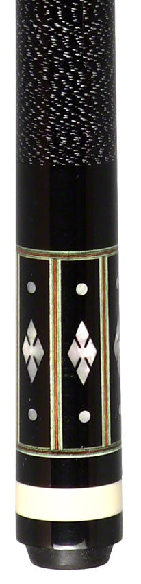 This traditional style Meucci cue features an antique stained Birdseye Maple forearm and butt with four Ebony inlay points lined in white, green & black veneers, black veneer window inlays with slotted diamond and dot pearled inlay accents, black & white coated Irish linen wrap, and the Meucci The Pro Shaft.  Black & white  polyurethane coated Irish linen wrap for a slick feel.