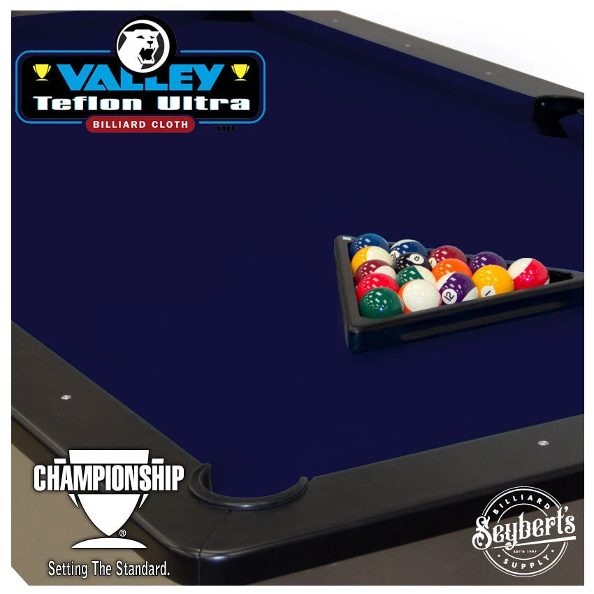 Valley Teflon Ultra  Navy is the same great cloth as the popular Mercury Ultra. The only difference is the Valley Teflon Ultra is bathed in Dupont Teflon before the fabric is weaved creating the only truly liquid-resistant fabric. Teflon Ultra is a 19oz weight woolen fabric that undergoes the same finishing process as the higher-priced worsted cloths. This woolen-hybrid fabric stain-resistant cloth was created for the players who demand the speed, consistency, and true rolls of a worsted cloth but do not want to pay the higher prices that come with it.