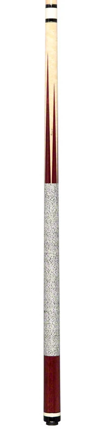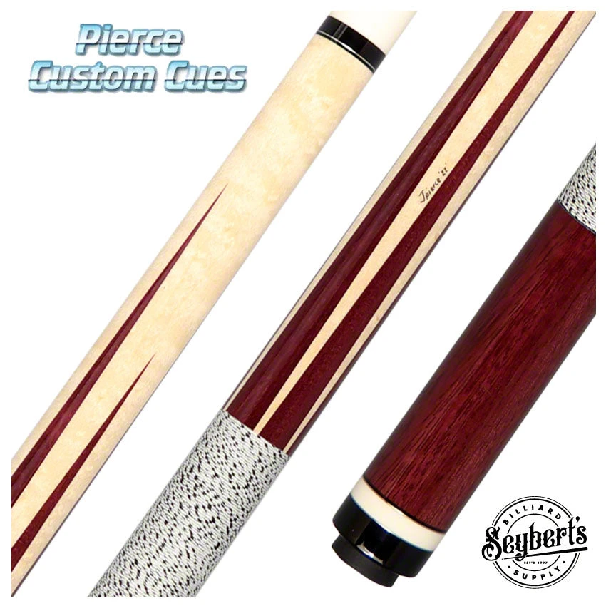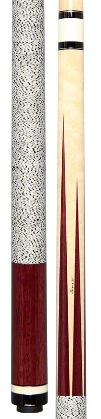 One of the newest cues from Jim Pierce Custom Cues collection. Starting this Pierce’s 58-inch cue out is a Birdseye Maple forearm construction with six bold Purpleheart points. The Butt sleeve of this Pierce cue is made up of a beautiful hand select piece Purpleheart wood as well as White and Black Hoppe material that make up the butt cap. Highlighting Pierce’s entire cue is stunning brass, and T34 Hoppe rings. Completing this custom cue off is a simple yet stylish white with black spec linen wrap. Pierce’s custom cue also comes complete with a old-growth shaft (4.0 oz.), a Kamui Black medium tip, T34 ferrule, and a Radial pin. The butt weight for Pierce’s cue is 15.0 oz for a total cue weight of 19.00 oz.