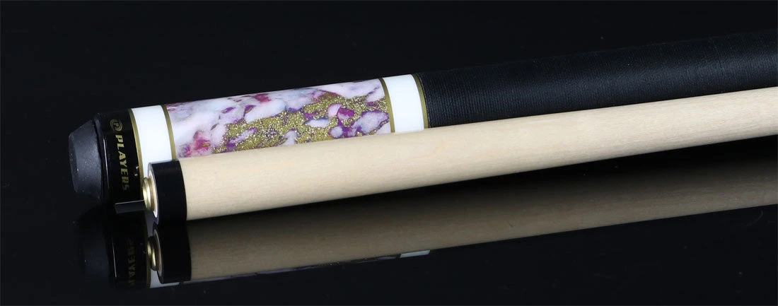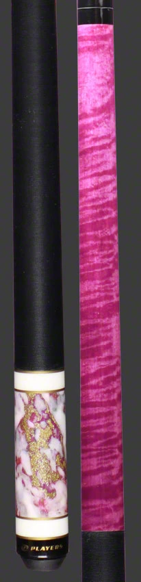 The Players C946 Pool Cue has a  magenta stain maple forearm. Butt sleeve has a white,  magenta, and gold dust quartz design. Other features include solid double-pressed Irish linen wrap, black Implex joint collar and butt cap.  Special High-Impact Ferrule  so durable it comes with a Lifetime Warranty  against chipping or cracking.  High-gloss Super UV Finish  protects cue from fading & chipping.