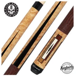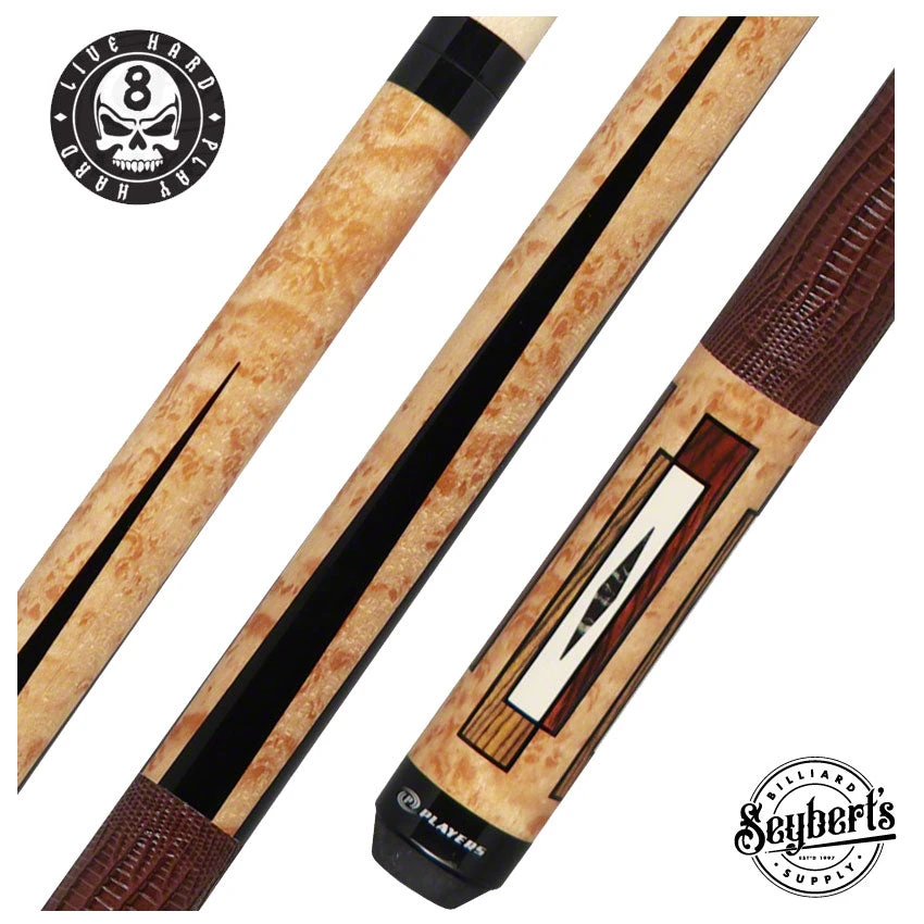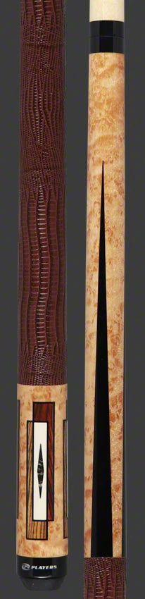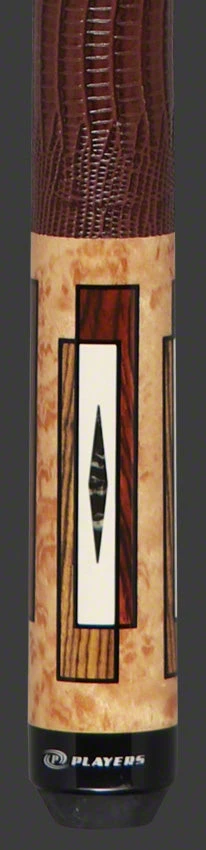 Players E2340 Exotic Pool Cue designs let simple beauty shine through. The E2340 Exotic cue features antique maple, cocobolo, bocote, and black crush graphics accented with a brown lizard-embossed leather wrap.