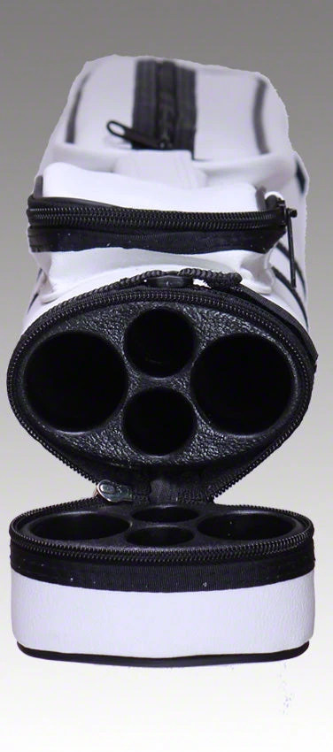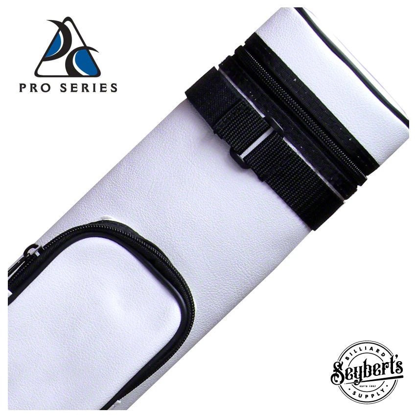 Pro Series White 2 butt/ 2 shaft Classic leatherette Hard Polyform case with large jump cue pocket and medium accessory pocket. These cases also feature zip closure and heavy-duty bottoms, as well as a padded handle and carrying strap.