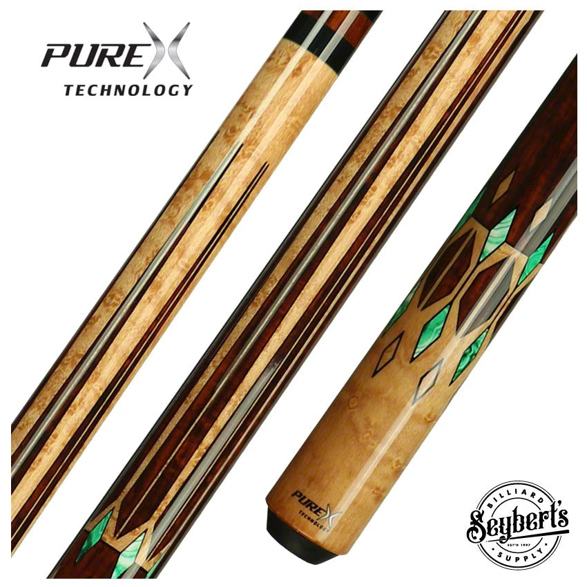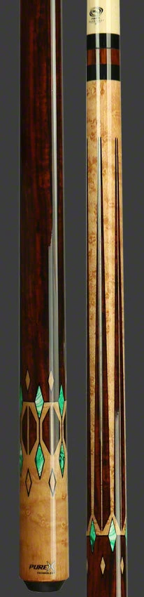 Pure X Technology HXT72 Pool Cue. Â This modern classic Pure X Â cue features an antique golden stained Birdseye Maple forearm and butt with floating split graphic Rengas points, green and natural accent diamonds, sleek wrapless handle, wood butt cap, and Pure X Â HXT Low Deflection Technology Shaft. Â Â