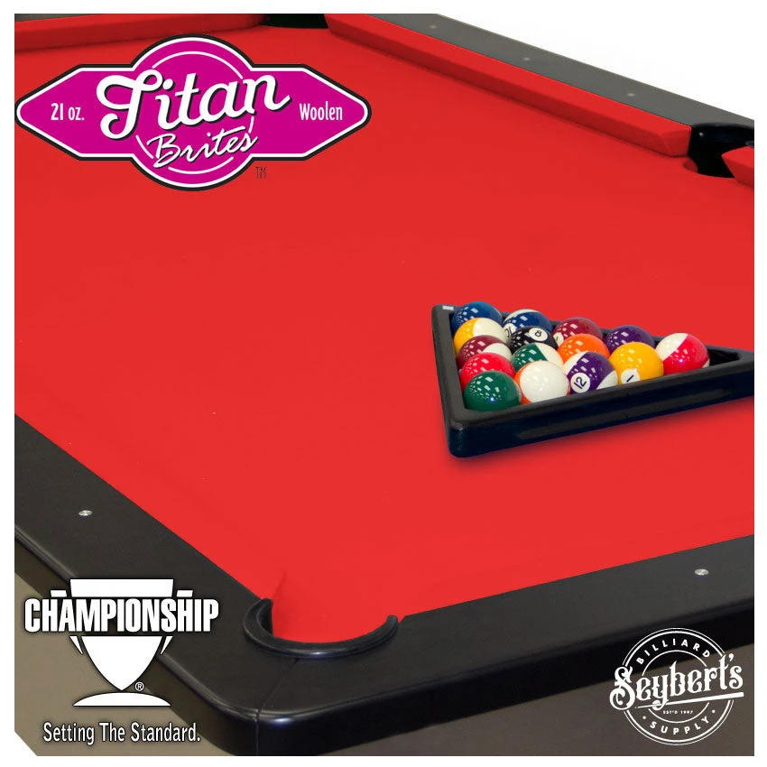 Titan Brite Red Championship Billiard Cloth. Championship Billiards Brite Table Felt is a 21oz weighted fabric. The Titan Brite cloth has the  same quality as found in the Championship Titan cloth but is now in a variety of very vibrant colors.