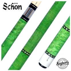 Presenting one of the newest cues from Schon the SPHULK Play Cue. Starting this Cue out is a bright green forearm and wrap section. This cue is also accented with alternating gold and black blocks inside magnificent silver ringwork. Finishing up this cue is an all white butt cap construction.