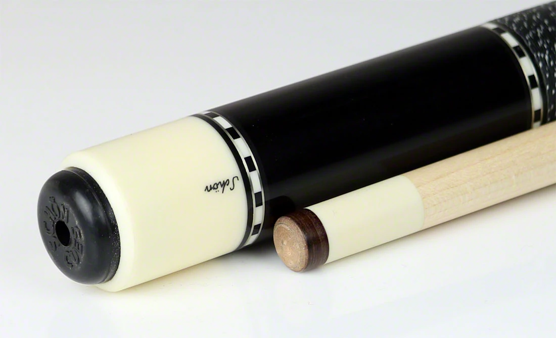 Schon STL5B has a Birdseye maple forearm with 4 Ebony points outlined with blue colored inlaid veneers. The butt sleeve is Ebony with a custom silver ring. Completing the cue is a black  and white Irish linen wrap. The cue weight is 19.6 oz. Please Note – Stains Color, Inlay Material, and butt cap color may be different than that show. Schon Cue’s policy is to use a variety of different stains, inlays materials, and butt colors to help ensure the uniqueness of each cue. The actual cue design will remain the same.