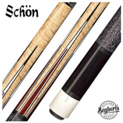 Schon STL6 has medium stained Birdseye maple forearm with 6 Bocote and micarta points. The butt sleeve is made of ebony and is completed with a black and white wrap with triple silver rings on both ends. Please Note – Stains Color, Inlay Material, and butt cap color may be different than that show. Schon Cues policy is to use a variety of different stains, inlays materials, and butt colors to help ensure the uniqueness of each cue. The actual cue design will remain the same.