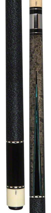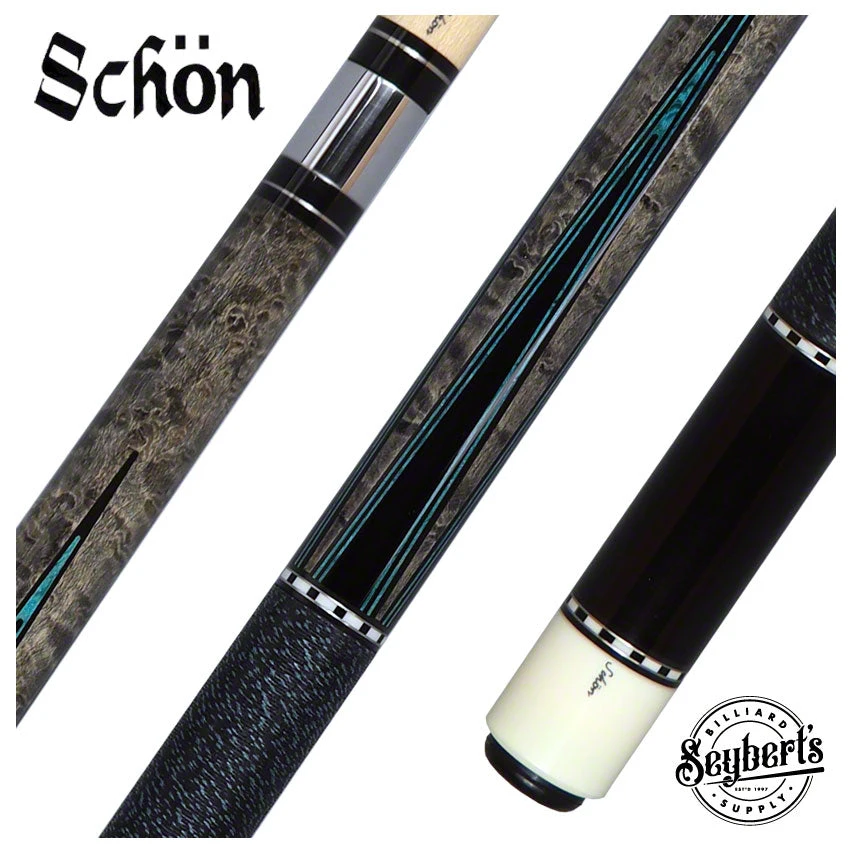 The Schon STL5GS Pool Cue is a unique and eye-catching cue, perfect for an experienced pool player. Featuring a grey stained Birdseye maple forearm with four ebony points outlined in blue inlaid veneers, an ebony butt sleeve with a custom silver rings, and a black and blue Irish linen wrap, this cue is sure to stand out against the competition.