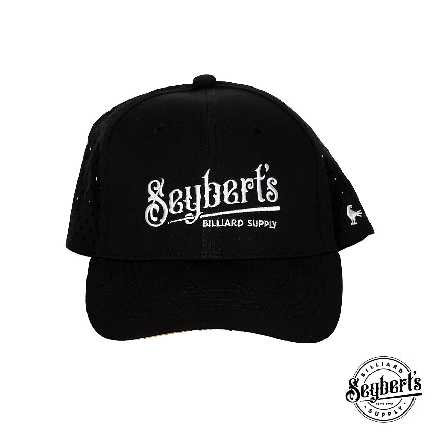 This black perforated hat combines comfort and style with an adjustable fit that suits most heads and breathable ventilation for all-day wear. Featuring an embroidered Seybert’s logo and a striking raven on the side, it offers a modern yet bold aesthetic. The unique pool ball graphic under the bill adds an exclusive, elegant touch, making it a refined accessory for billiards enthusiasts.