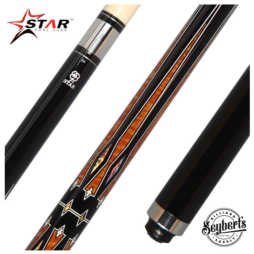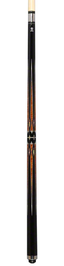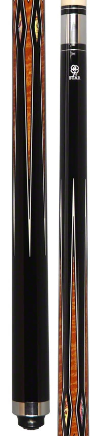 The Star Cues S82 Play Cue is a professional-grade pool stick made with premium Hardrock maple, featuring a sleek black paint, silver rings, and multi-color overlay butt has a unique brown, black, and abalone diamond graphic design along the wrap section.. It is designed with a stainless steel joint collar and butt plate and a 3/8″-10 joint. The traditional Hardrock maple shaft has a unique brown, black, and abalone diamond graphic design along the wrap section.