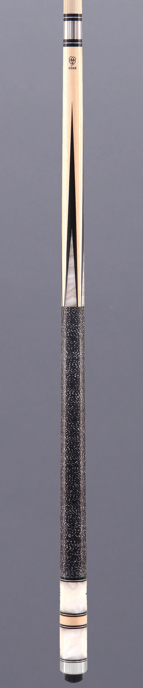 Star S25 cue has a  natural Maple forearm with 4 white  pearl and black points overlay design. The butt sleeve has 2 white pearl inlaid rings with a natural Maple ring in the middle. Completing the cue is silver  ring work, stainless steal butt cap, and black / white  Irish linen wrap.